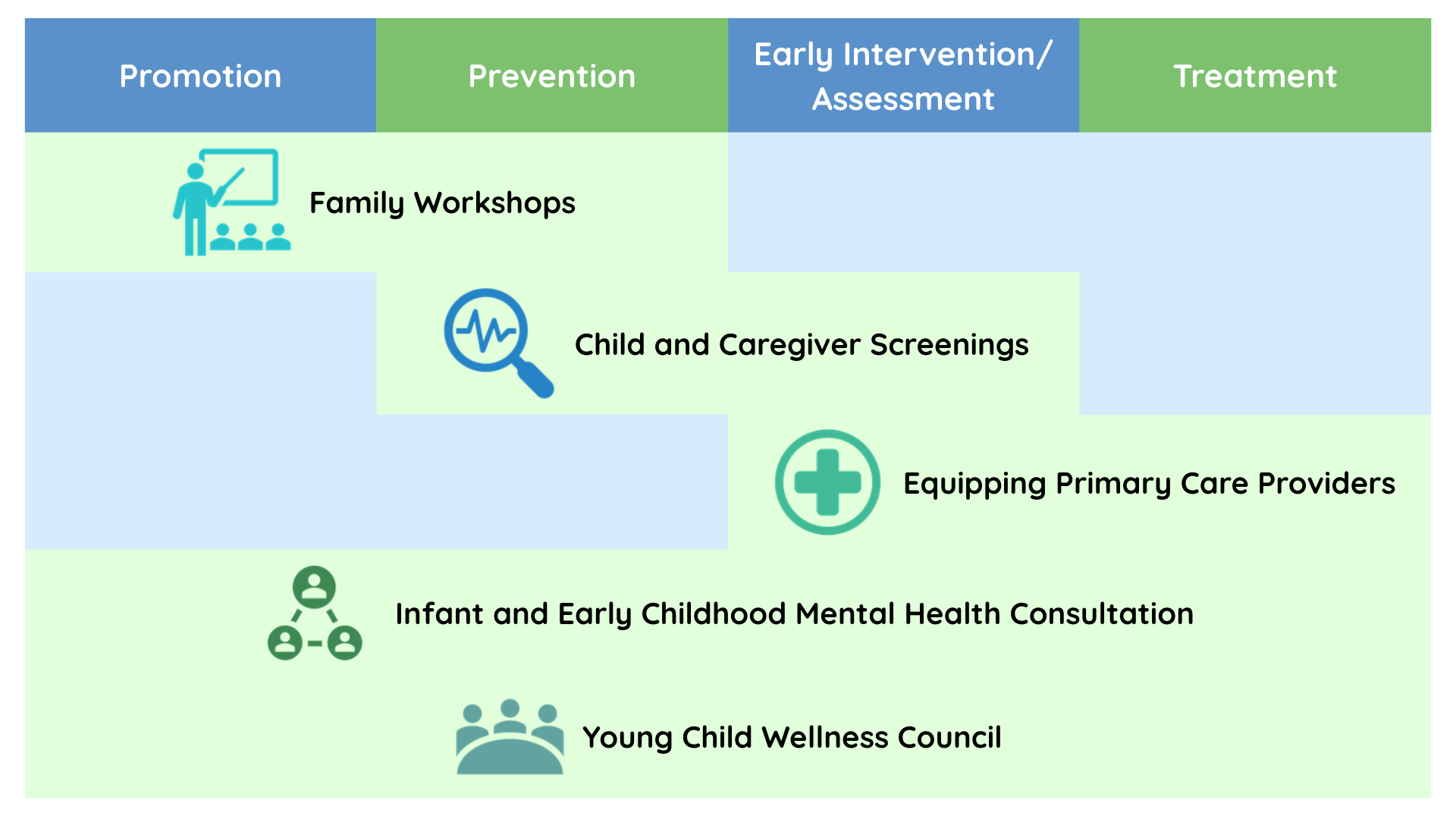 - Year 2 (2024 – 2025): Further expanded on this foundation, building relationships with partners and learning about the needs and capacities of service providers in supporting infant and early childhood mental health.