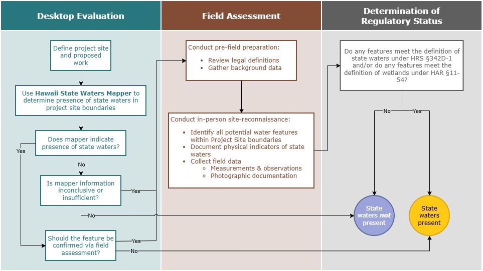 The recent changes to WOTUS have shifted the regulatory landscape, prompting questions about where state authority applies. In an effort to use time and resources efficiently, this section provides guidance for identifying Hawaii state waters within a proposed project site from a desktop environment. While a desktop approach is limited by a variety of factors, including data availability and accuracy, it serves as a crucial first step in determining the presence of state waters as defined by HRS §342D-1.