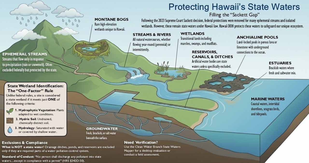 In response to the 2023 Supreme Court Sackett decision, the definition of “Waters of the United States” (WOTUS) was narrowed, excluding ephemeral streams and certain wetlands without continuous surface connections to navigable waters. As a result, these non-WOTUS state waters—including unique Hawaiian ecosystems—are no longer subject to the U.S. Army Corps of Engineers’ (USACE) federal permitting process. Although these waters remain protected under Hawaii Revised Statutes (HRS) HRS §342D-50, which prohibits unauthorized discharges into state waters, the Sackett decision created a gap in the permitting process where federal jurisdiction no longer applies. To address this gap, the Hawaii Department of Health (DOH) is providing guidance to clarify how state waters are identified and regulated. This guidance discusses the definition of state waters and helps the public determine whether state waters are present to ensure compliance with state water pollution control laws.