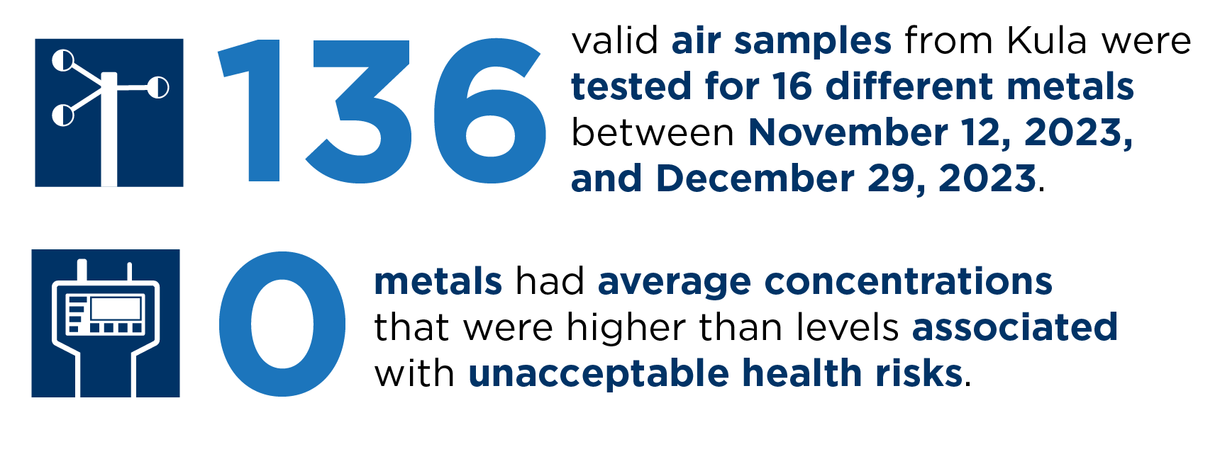 Antimony, arsenic, cobalt, copper, and lead are substances that occur naturally in rock and soils in Hawaii and elsewhere. These substances are also found in a wide range of consumer products and structural materials. After the wildfires burned in Kula, these harmful substances were detected in the ash. At high levels of exposure over long time frames, breathing in these substances can cause a range of non-cancer health effects. For some of these substances, like arsenic, longer term exposure at high levels can cause cancer. During the Kula debris removal activities, DOH collected air samples every day at three locations and had those samples analyzed for metals.