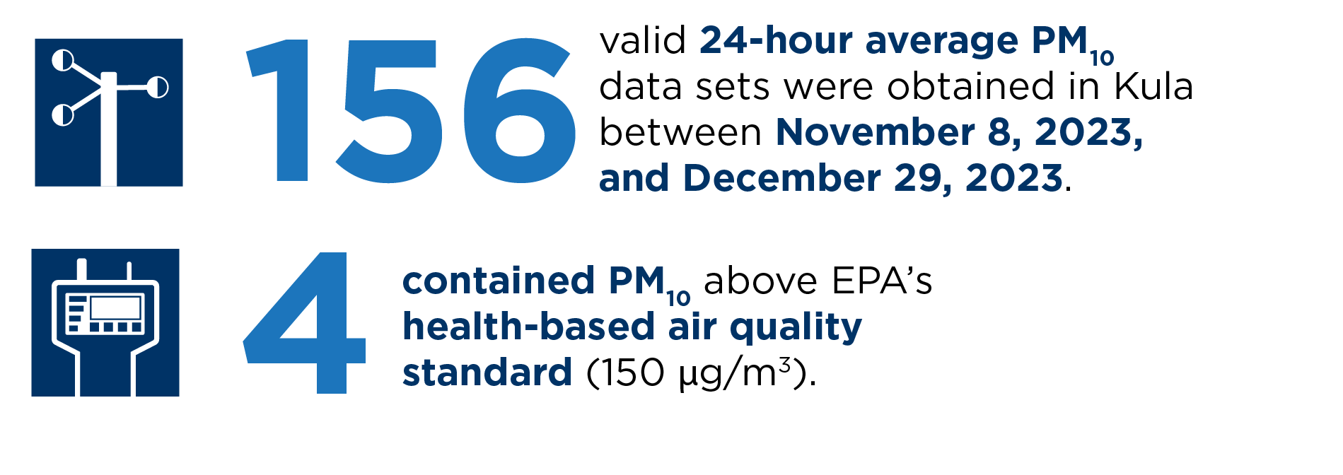 PM10 particles are airborne particles that are smaller than fine grains of sand—and they are smaller than the thickness of human hair. PM10 comes from many different sources, like wind-blown dust, construction, cars, and agriculture. PM10 measured in Kula could have contained ash from the fires, as well as dust and particles from other sources. During the Kula debris removal activities, DOH performed 24 hour/day air monitoring of PM10 at three community locations.