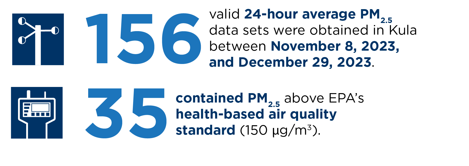 PM2.5 particles are airborne particles that are so small that they can go deep into your lungs. PM2.5 in Kula could have contained ash from the fires, and it could also have come from other sources. During the Kula debris removal activities, DOH also conducted 24 hour/day air monitoring of PM2.5 at three community locations.