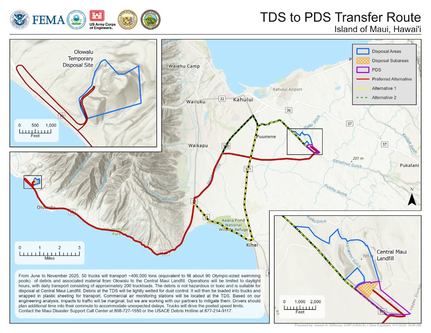The West Maui TDS Site served as a temporary site for ash and debris disposal until the PDS could be constructed. On February 28, 2024, Mayor Richard Bissen announced that the PDS would be at the Central Maui Landfill. The PDS needed to be constructed and operational prior to ash and debris transfer from the TDS Site to the PDS. The County of Maui and USACE developed a plan with processes and procedures for the safe loading, transportation, and disposal of ash and debris at the PDS, as well as closure of the TDS Site. The transfer process began in mid-June 2025 and is expected to continue until November 2025. Procedures include the following: