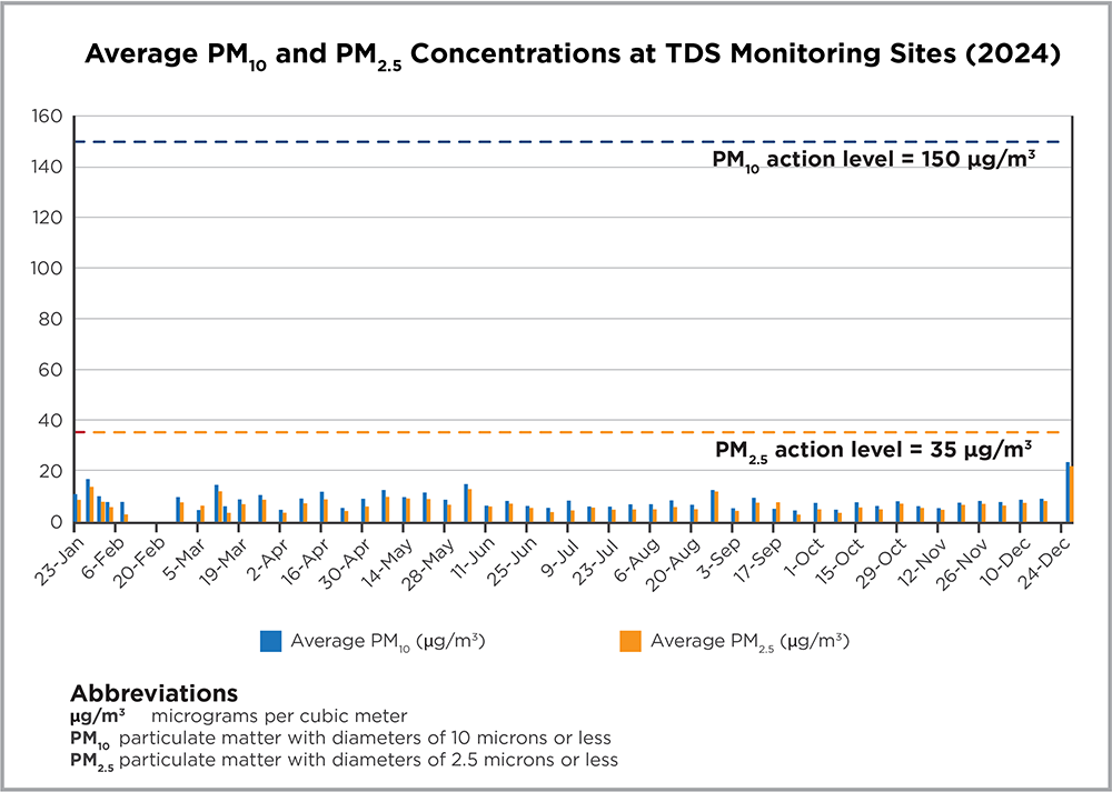 USACE contractors used air monitors to measure airborne particles (both PM2.5 and PM10) near debris removal sites and continue to use them around the TDS Site (Figure 3). The number and locations of air monitors at the TDS Site may vary based on weather conditions and operations. USACE’s data for 2024 and 2025 are shown in Figures 4 and 5. The figures show particulate matter concentrations averaged between the two monitoring sites around the TDS Site. Particulate matter concentrations at individual monitoring sites vary, with some higher and some lower than the averages shown. Air monitoring was paused from April 30, 2025, to June 17, 2025, when the TDS Site was temporarily closed and no site operations were taking place. Monitoring resumed when transfer to the PDS began, and daily samples are being taken through the completion of transfer and closure operations. Figures 4 and 5 show that all measurements for both PM2.5 and PM10 have been below their respective action levels set for operating the TDS Site (35 μg/m3 for PM2.5 and 150 μg/m3 for PM10). USACE’s recent site monitoring reports are available here.