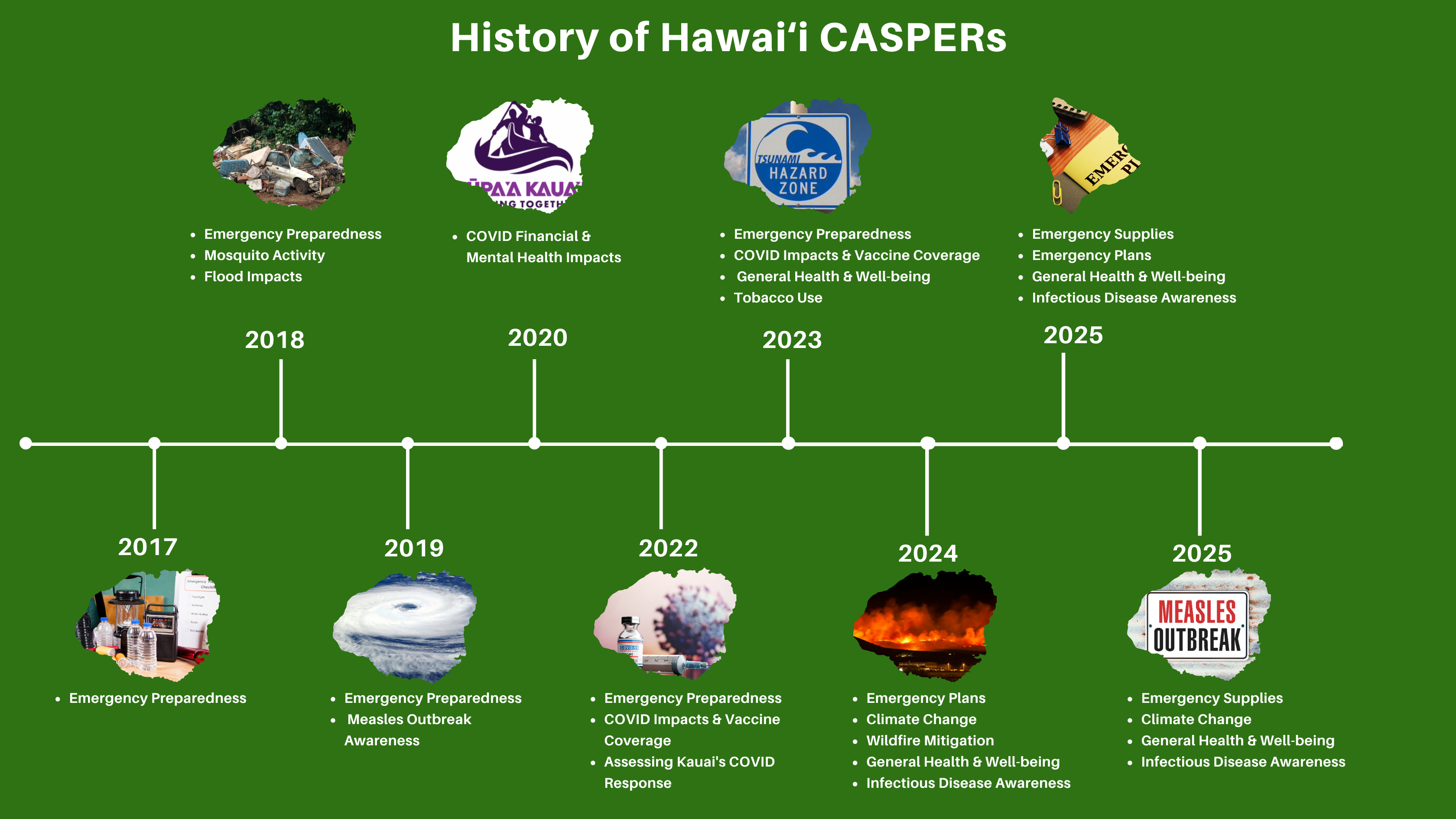 While the CASPER methodology is typically used to assess disaster-related impacts and needs, CASPERs can also be used to establish baseline preparedness levels and build capacity to conduct CASPERs post-disaster. The Kauai District Health Office (KDHO) conducted CASPERs annually from 2017-2025 (excluding 2021) to monitor trends in the emergency preparedness of island residents. Several of these CASPERs also included disaster components such as evaluating impacts from a major flood event as well as the COVID-19 pandemic.